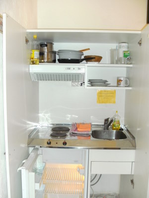 Pantryküche mit Spüle, Zweiplattenherd und Kühlschrank sowie