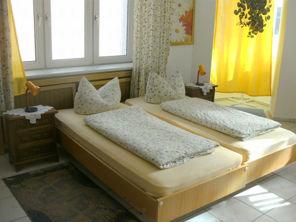 Familienzimmer für insgesamt 4 Gäste Blick aufs Doppelbett Blick vom Doppelbett zur Essecke am Fenster Blick zum zum Wandbett (ausklappbar für insgesamt nochmals 2 Gäste) |